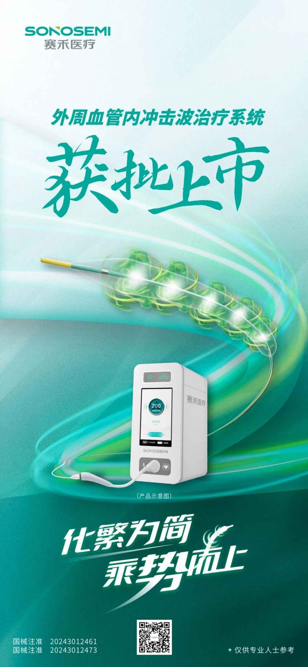 赛禾医疗董事长刘斌先生表示:非常高兴看到赛禾医疗外周血管内冲击波治疗系统正式获批,本次外周冲击波治疗系统的获批,不仅为外周领域的临床医生和广大患者提供了一个全新的治疗选择,我们也相信该产品令人瞩目的安全性、有效性和易操作性可以更好地满足临床需求,挽救更多生命。赛禾医疗将不忘初心,持续致力于技术创新,构建泛血管有源精准介入诊疗一体化平台,为临床诊疗场景赋能。
