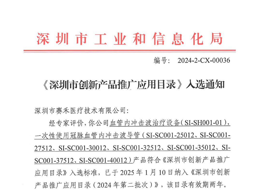 近日,深圳市赛禾医疗技术有限公司自主研发的血管内冲击波治疗设备及其配套的一次性使用冠脉血管内冲击波导管,凭借其创新技术与显著临床价值,成功入选《深圳市创新产品推广应用目录(2024年第二批次)》。继公司心腔内超声成像(ICE)系统入选2024年第一批次目录后,赛禾医疗创新实力再次获得政府层面的高度认可。