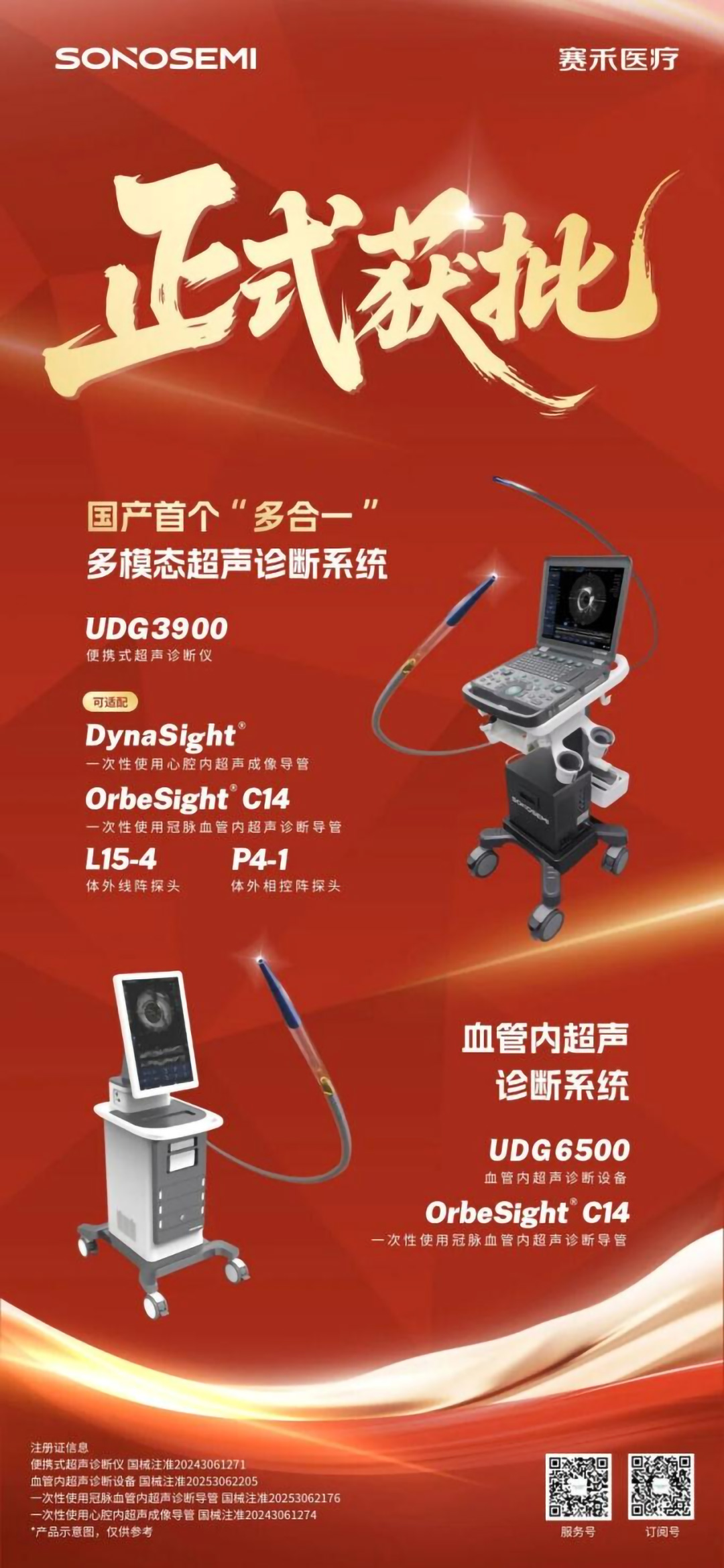 赛禾医疗”多合一”多模态超声诊断系统包括UDG3900系列便携式超声诊断仪(国械注准:20243061271),可同时适配DynaSight®一次性使用心腔内超声成像导管(国械注准:20243061274)、OrbeSight® C14一次性使用冠脉血管内超声诊断导管(国械注准:20253062176)、L15-4体外线阵及P4-1相控阵探头。
